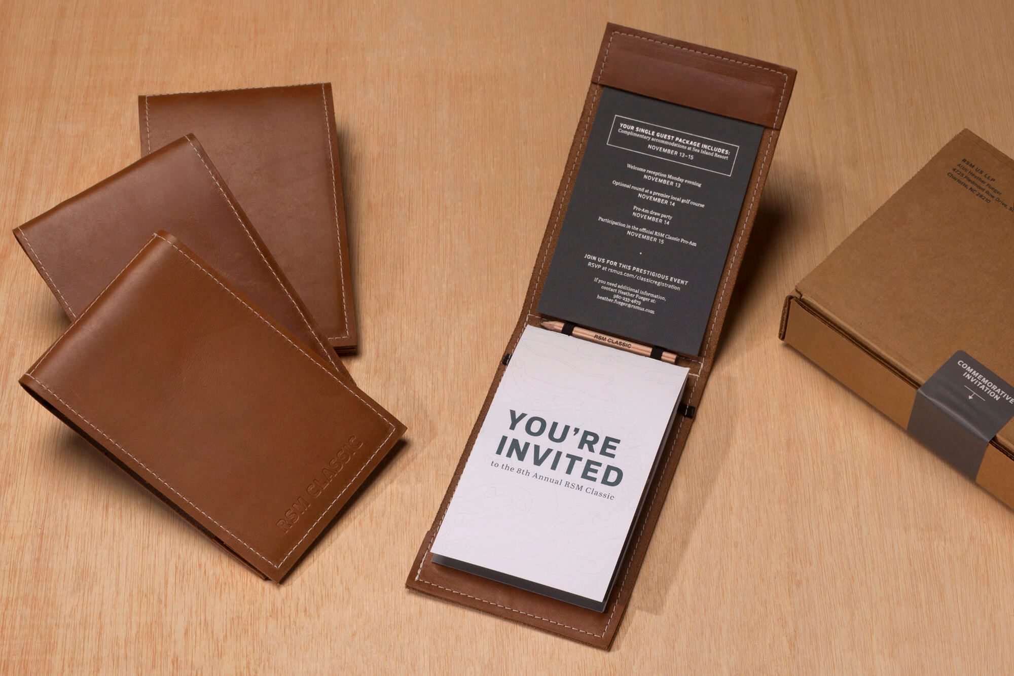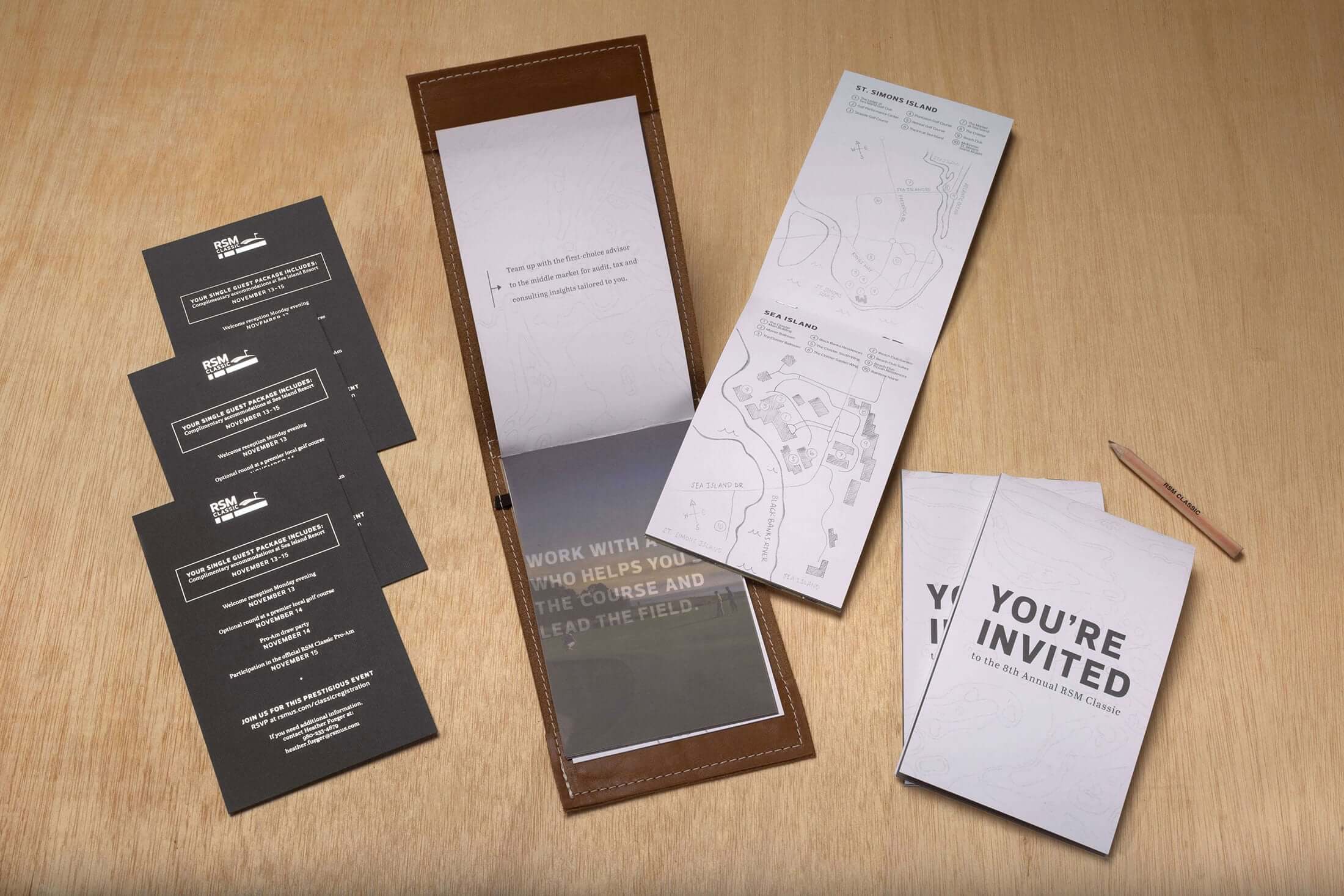 Designed as a functional invitation for the RSM Classic, a charity golf tournament in Sea Island, this regulation size, leather-bound yardage book delivered an event brochure as well as a letter-pressed ticket to top-level executives. This keepsake included details about the resort, what each guest’s package included as well as a branded golf pencil.